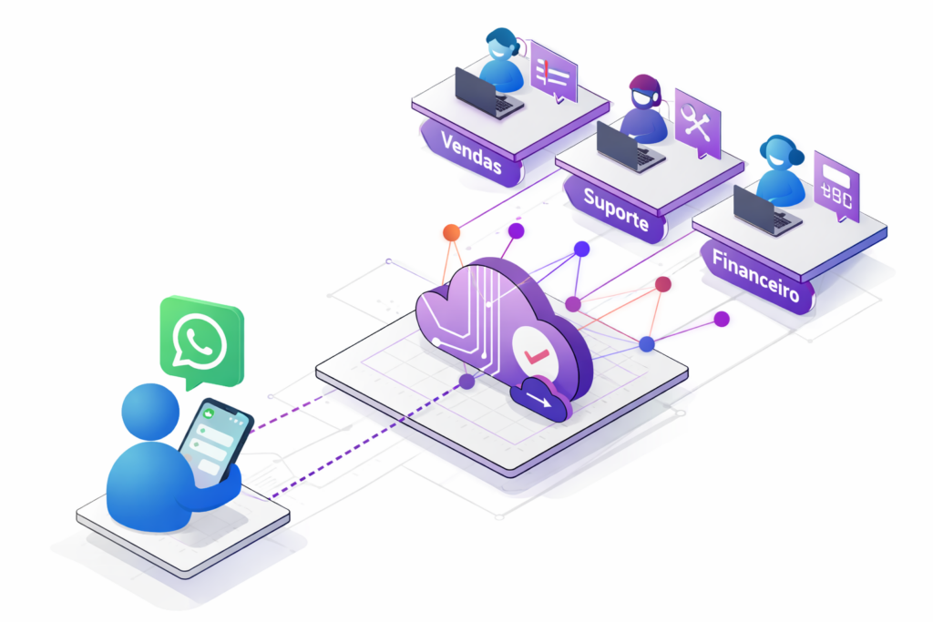 Direcione conversas automaticamente para Vendas, Suporte ou Financeiro. Agilize respostas e melhore a experiência do cliente.